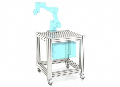 This work bench island is easy to expand and has everything you need for using a cobot. Profiles XMS with their integrated cable conduit safely accommodate cables and operating elements. Thanks to the variable Groove Plate, the robotic arm and accessories can be positioned wherever they are needed. The frame provides storage space and room for the control system. Every dimension of the basic design can easily be adapted to your working environment during the planning stage. The frame is compatible with the item MB Building Kit System, enabling the use of the entire portfolio of profiles, Castors, Adjustable Feet and accessories.