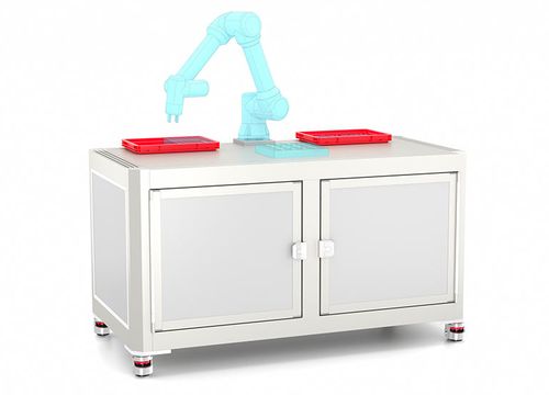 EX-01582For efficient production with workpiece carriers, this workstation offers two storage positions to the right and left of a centrally positioned cobot. The central cable feed-through also allows cables to be routed from below to robot arms with bottom connectors or to operating units.