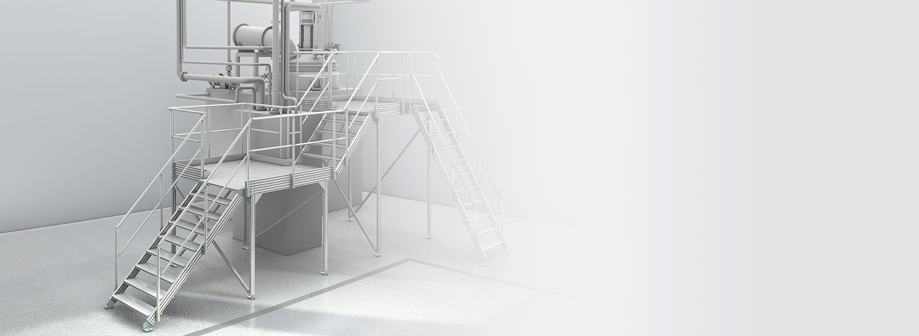 The item Stairway/Platform System makes it easier than ever to reach every part of a machine and work on various levels. Bridges, maintenance platforms for elevated sections of machinery and all-round working platforms can all be built using the same system. Use item fastening technology to build stable machine steps and structures.